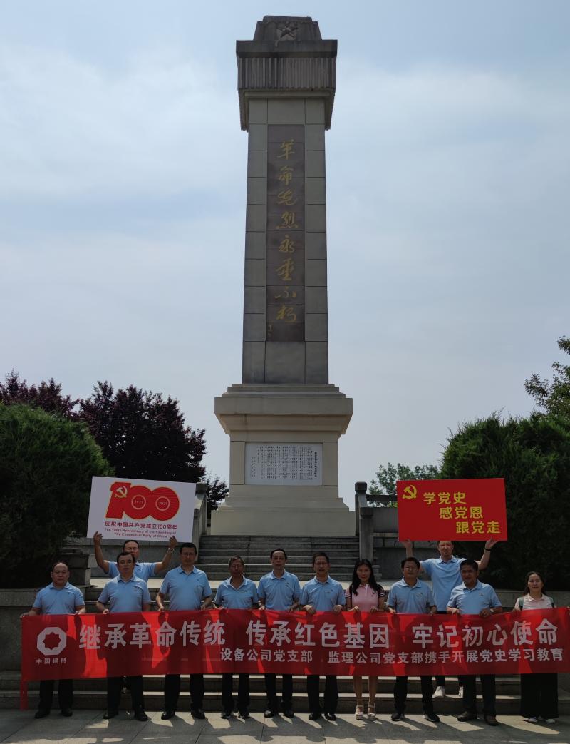 為了慶祝中國共產黨成立100周年,落實黨史學習教育工作計劃, 6月11日,我院設備公司和監理公司黨支部在中共安徽第一面黨旗紀念園和中國建材(合肥)技術中心工程項目現場開展主題為“學黨史、感黨恩、跟黨走”黨史學習教育實踐活動,支部黨員、入黨積極分子和部分中層以上干部參加了此次活動。